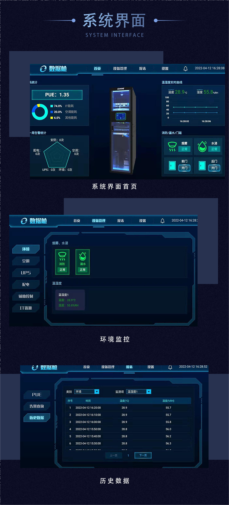 數(shù)據(jù)艙采用了嚴格的動環(huán)監(jiān)控系統(tǒng),包括煙霧監(jiān)控、溫濕度監(jiān)控、空調(diào)監(jiān)控、視頻監(jiān)控(選配)等,24小時保護IT設(shè)備安全。